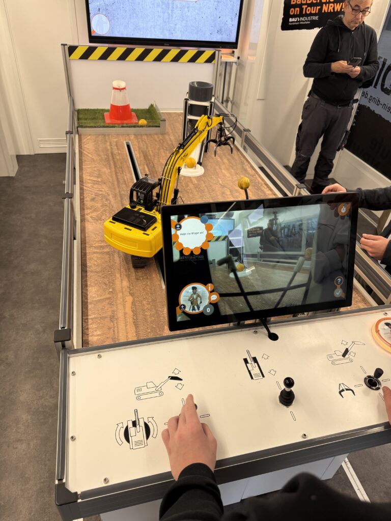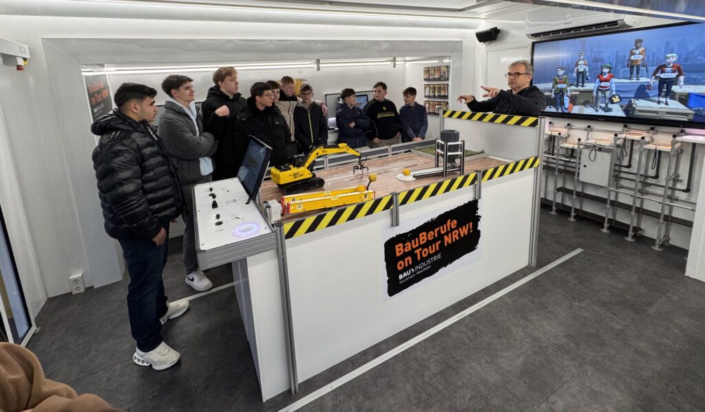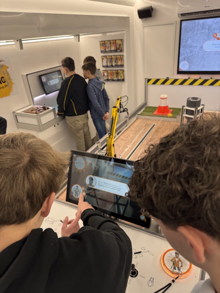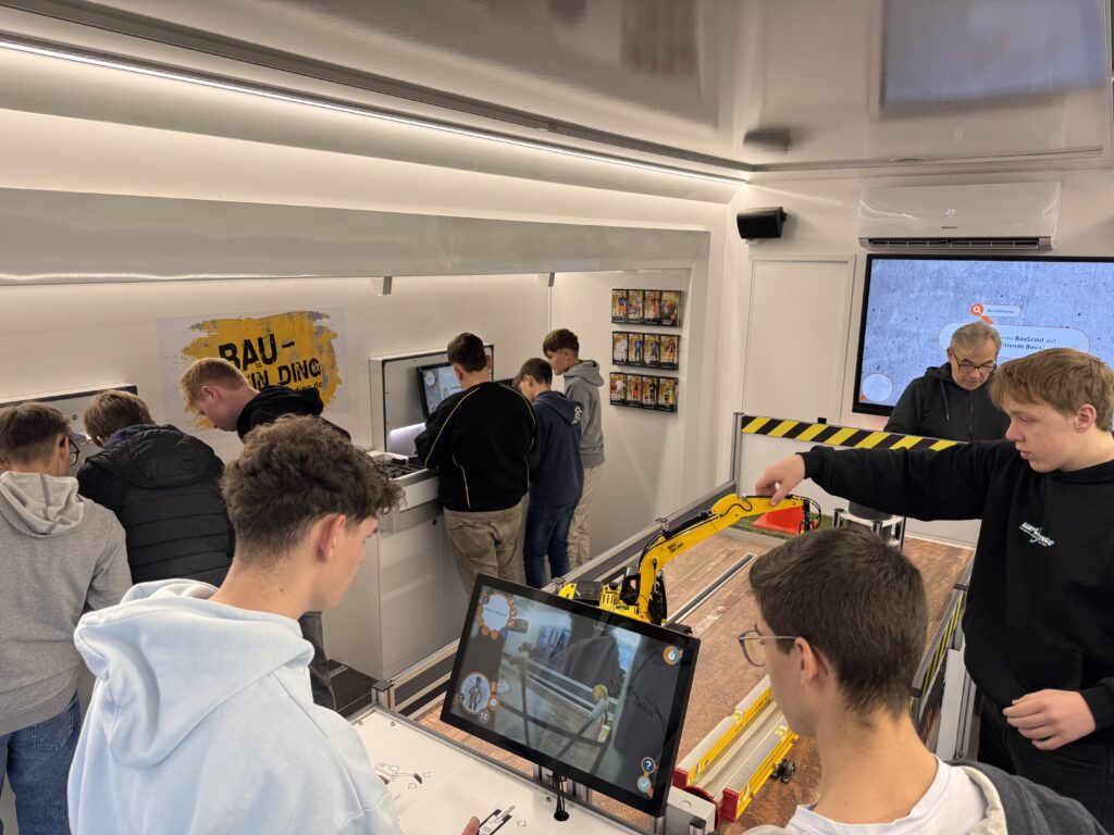 Im Baubus erwarteten die Schülerinnen und Schüler verschiedene interaktive Stationen, die im Rahmen einer Challenge aufgebaut waren. So konnten sie unter anderem einen Bagger steuern und bedienen, ein Haus planen, bauen und ausmessen sowie praktische Aufgaben lösen, die typisch für Berufe auf dem Bau sind.