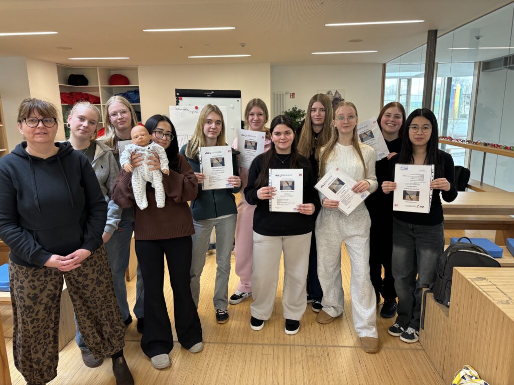 Am Freitagnachmittag (30.01.2026) und am Samstagvormittag (31.01.2026) nahmen zwölf Schülerinnen aus dem Jahrgang 9 an dem neunstündigen Babysitter-Kurs teil. Die Referentin Frau Kranepuhl von der VHS Soest bereitete die Teilnehmerinnen sehr gut darauf vor, verantwortungsvoll auf Säuglinge und jüngere Kinder aufzupassen. Der Kurs vermittelte wichtige theoretische und praktische Grundlagen rund um die Betreuung von Babys und Kleinkindern. In einer tollen Atmosphäre in der Mediothek arbeiteten die Teilnehmerinnen an Themen wie Sicherheit im Alltag, altersgerechte Beschäftigung, die Entwicklung von Babys, Umgang mit schwierigen Situationen und einen ersten Einblick in die Grundlagen der ersten Hilfe.