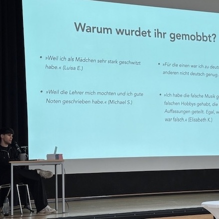 Die Schülerinnen und Schüler brachten sich in die Lesung ein, stellten Fragen und gaben Hinweise, dass einige im Auditorium das Thema aus eigenem Erleben kennen. Eine spontane, geheime Abfrage, wer schon einmal Mobbing erfahren hat, führte zu dem Ergebnis, dass jeder und jede Dritte Mobbing selbst kennenlernen musste. Die Schülerinnen und Schüler schien dies Ergebnis wenig zu erstaunen.